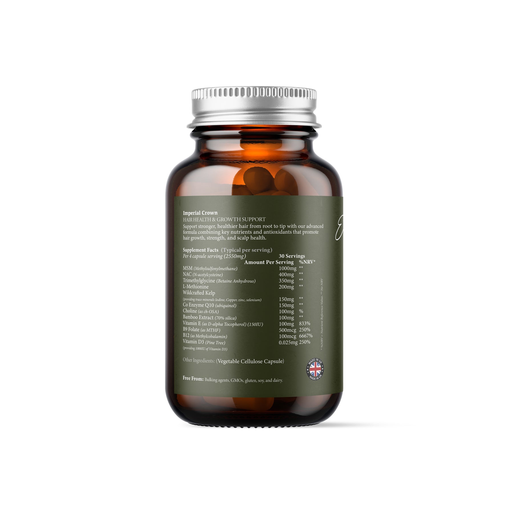 Imperial Crown is a carefully developed blend of nutrients and botanicals designed to nourish hair from within. It combines structural building blocks such as MSM, silica, and methionine with supportive antioxidants and vitamins, helping to maintain healthy hair, skin, and connective tissue.